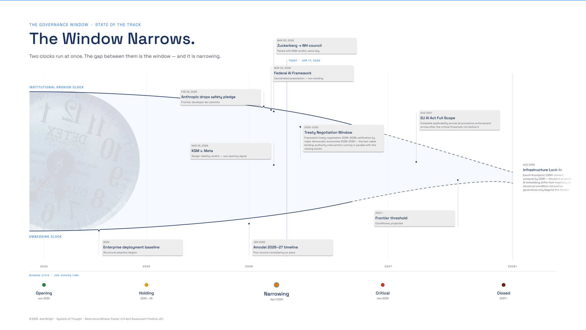 The full Tracker, with domain-level signal readings, adequacy test scoring, and the methodology behind the two-clock framework, is being prepared for publication here. It will be updated on a rolling basis as conditions change.