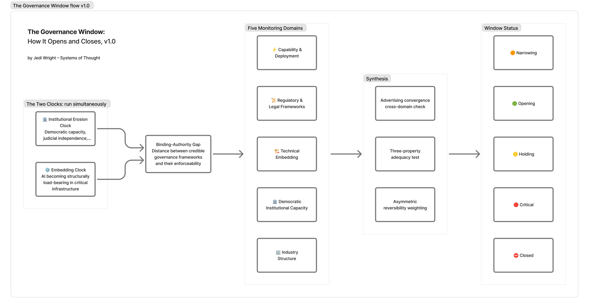 The AI Governance Window Tracker—a structured five-domain instrument for monitoring whether the binding-authority gap is narrowing or widening, is here: The AI Governance Window Tracker v1.5 (public agentic skill coming soon).