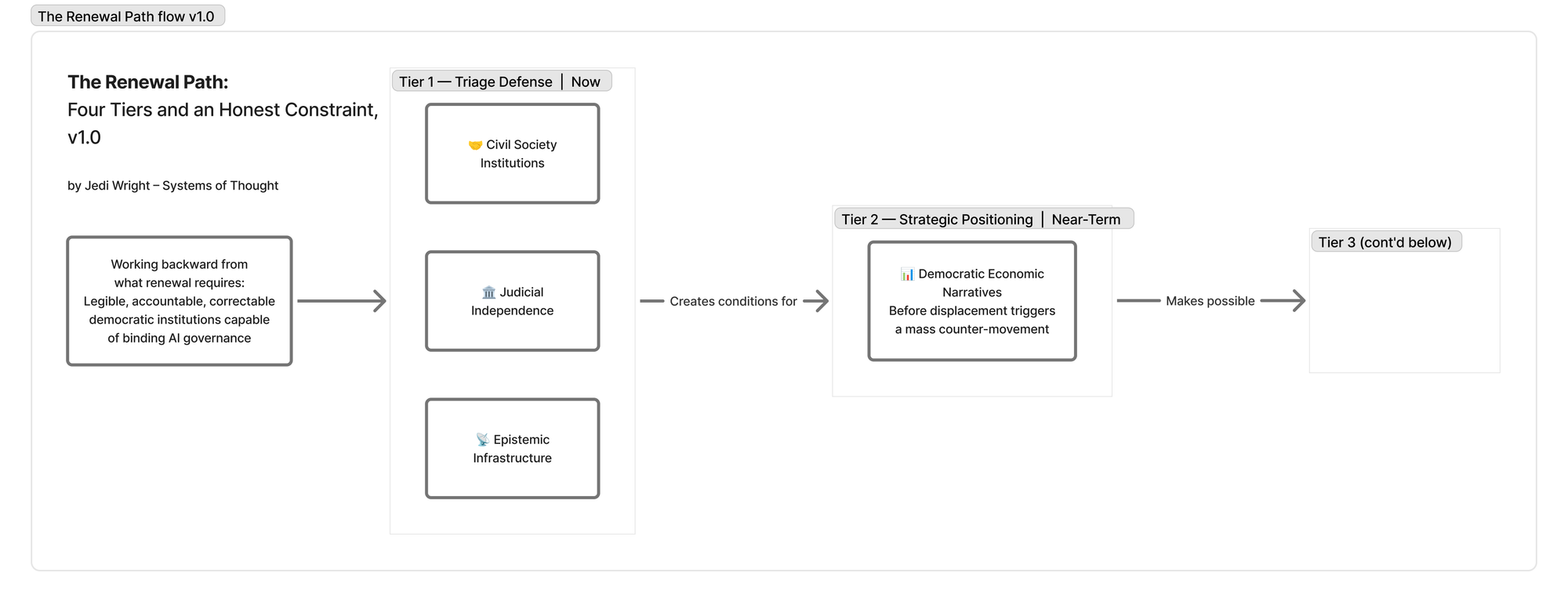 The first is triage defense: judicial independence, epistemic infrastructure, and civil society institutions. Not because these are sufficient, but because they are the preconditions for everything else. A governance coalition that forms without functioning courts, without shared epistemic ground, without civil society institutions capable of translating public demand into political pressure cannot hold.